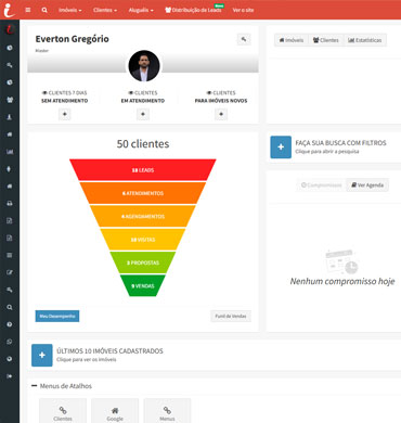 Tela de início com informações do funil de vendas, compromissos, lembretes de aniversários de clientes, busca rápidas e com filtros.